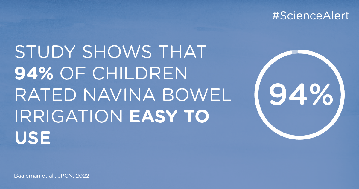 New science news reported in this study is that factors such as patient independence, patient experience, and patient empowerment were also investigated. The majority of children (61%) reported that since use of Navina Irrigation System their independence increased, and the use was considered easy or very easy by 94% of the children. Patient empowerment was measured with the Gothenburg Young Persons Empowerment Scale (GYPES) that showed similar levels as reported in children with other chronic conditions. However, more than half of the children found the use of TAI bothersome and the most bothersome was the time it takes.