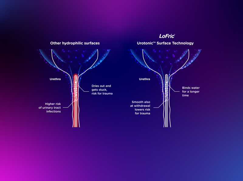 LoFrics unike overflate sikrer at kateteret ikke fester seg i urinrøret. Fordelen med LoFrics overflate er tydelig når du sammenligner den med andre hydrofile overflater. De fleste katetre er glatte ved innsetting, men ikke alle klarer å holde seg glatte ved uttak. Siden et LoFric kateter forblir glatt, muliggjør det skånsom kateterisering også under uttak, noe som resulterer i redusert risiko for urethral traumer, smerte og urinveisinfeksjoner.
